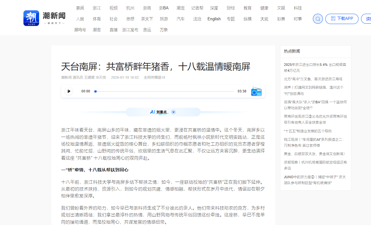 浙江年味看天台,南屏山乡的年味,藏在非遗的烟火里,更浸在共富桥的温情中。这个冬天,南屏乡以一场热闹的非遗年猪节,迎来了浙江科技大学的师生们,而前杨村枫林小院新时代文明实践站,正是这场校地温情邂逅、...