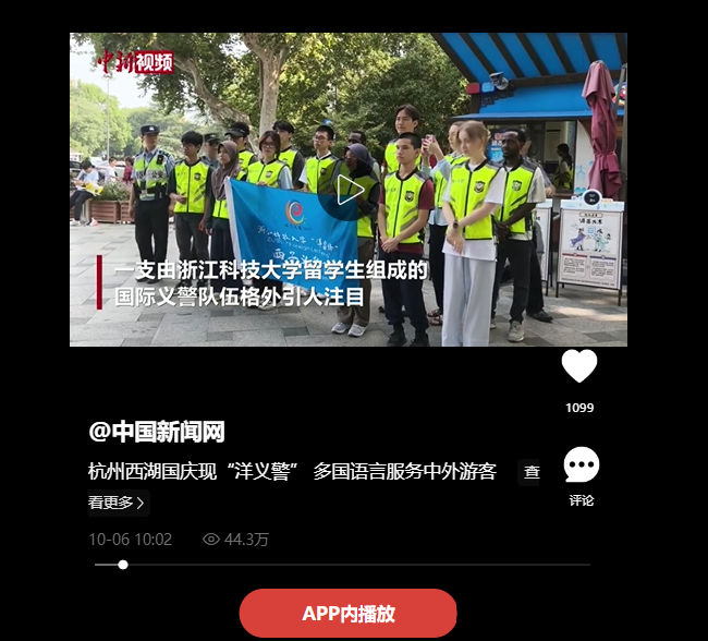 10月5日,在浙江杭州西湖风景名胜区内,一支由浙江科技大学留学生组成的国际义警队伍格外引人注目。队伍的14名成员来自不同国家,携手在此开展志愿服务活动,用多国语言服务中外游客。点击观