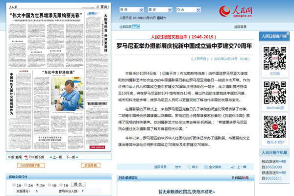 10月5日出版的人民日报刊登《罗马尼亚举办摄影展庆祝新中国成立暨中罗建交70周年》,新华社海外版发布《Romania holds photography exhibition to celebrate China's National Day》,报道我校罗马尼亚克鲁日孔院承办的庆祝中华人民共和国成立暨中罗建交70周年摄影展。