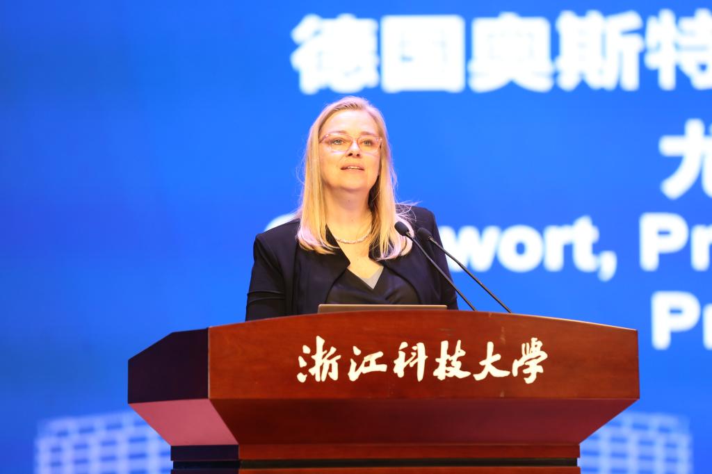 尤利娅·西格米勒代表与会德国高校对浙江科技大学中德合作40周年表示祝贺。面对全球技术变革与工业发展挑战,她强调高校应超越传统知识传授,注重学生跨学科素养与终身学习能力的培养,期待深化中德合作,共同推动工业文明互鉴与高等教育创新。