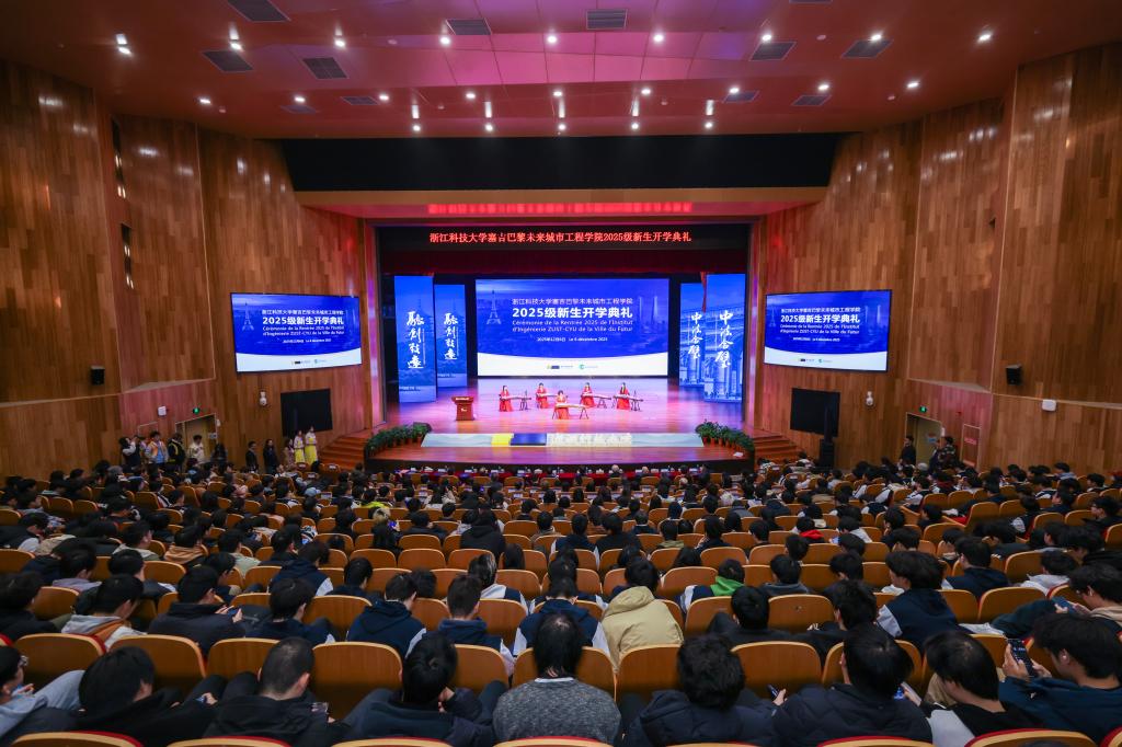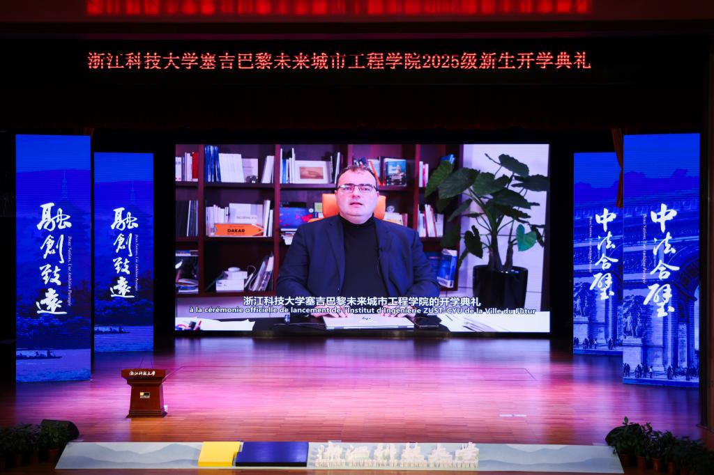 12月6日,浙江科技大学塞吉巴黎未来城市工程学院2025级新生开学典礼在小和山举行,浙江科技大学塞吉巴黎未来城市工程学院正式揭牌。浙江科技大学校长陈建孟,副校长李其朋,校党委委员、宣传部部长徐华军,校党委委员、组织部部长应荣球,法国塞吉巴黎大学副校长布鲁诺·菲奥里奥(Bruno FIORIO),法国塞吉巴黎大学中法大数据专业联合负责人丹·沃迪斯拉夫(Dan VODISLAV),法国塞吉巴黎大学中法大数据专业联合负责人迪米特里斯·科齐诺斯(Dimitris KOTZINOS),2022年度“西湖友谊奖”获得者、法国籍专家让-路易斯∙加利亚斯(Jean- Louis GALLIAS),杭州法盟中方校长陈建伟等参加典礼。
