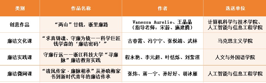 近日,教育部办公厅下发《关于公布第十届高校廉洁教育系列活动结果的通知》(教思政厅函〔2026〕5号),我校选送共4件作品入选本次廉洁教育活动优秀作品,涵盖创意作品、廉洁文化课、廉洁实践课、廉洁微网课四大类别,获奖数量位居浙江省高校并列第一。