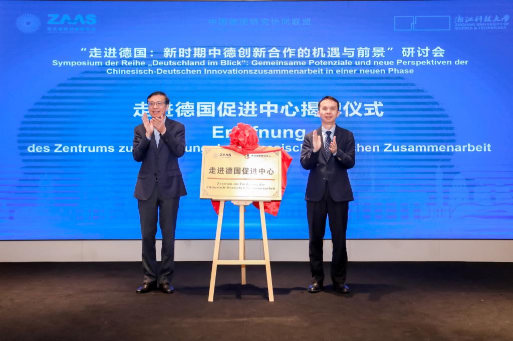 开幕式上,郭华巍、陈建孟为“走进德国促进中心”揭牌。该中心由浙江省区域国别学会和浙江科技大学共同发起成立,致力于整合研究和实践资源,推动对德经贸、科技等领域的全方位合作。同时,浙江科技大学德语国家研究中心与浙江省投资促进中心(浙江省驻外商务机构服务中心)签署战略合作协议,双方将围绕服务浙企全球化布局,在资源共享、双向投资服务、人才队伍培养等方面开展深度合作,共同打造“政产学研”协同的企业出海服务平台。