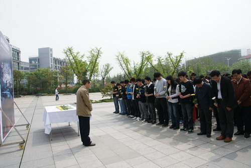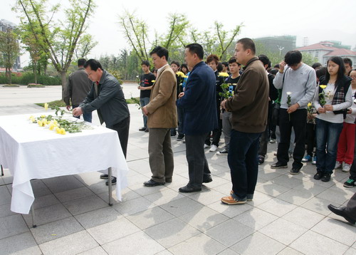 上午十时,数百名师生在银杏广场集会悼念同胞。他们身着素衣,手持菊花,低头默哀。一位参加活动的同学说:“只有我们感受祖国的痛苦与灾难,我们才有资格享受祖国的荣耀与尊严!”