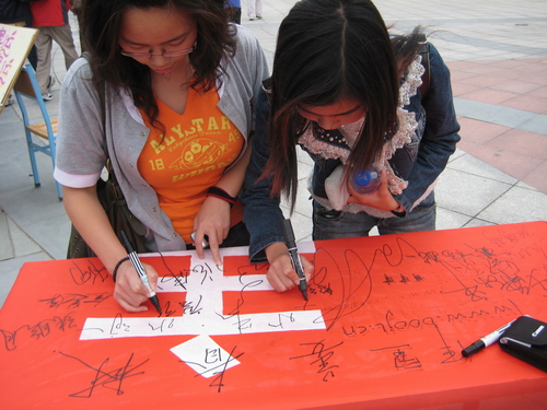 4月26日,青年志愿者协会在小和山校区举行“迎奥运,爱在科院,国在心中”大型签名、涂鸦活动。许多同学和老师都在横幅上签下自己的名字,并写下了对北京奥运会的美好祝愿。同学们还踊跃询问关于奥运知识竞赛及志愿服务等活动的有关事项。不少同学表示去北京为奥运服务是自己的一个梦想。