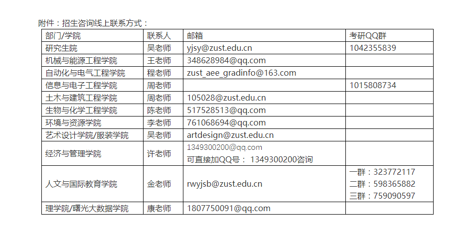 4. 为保障广大考生、教师的生命安全和身体健康,疫情不除,我们不组织也不允许我校教师参与线下招生复试咨询等相关活动,各位考生如有任何问题,可通过线上的方式(电子邮件、QQ群等)联系咨询,联系方式详见附件。