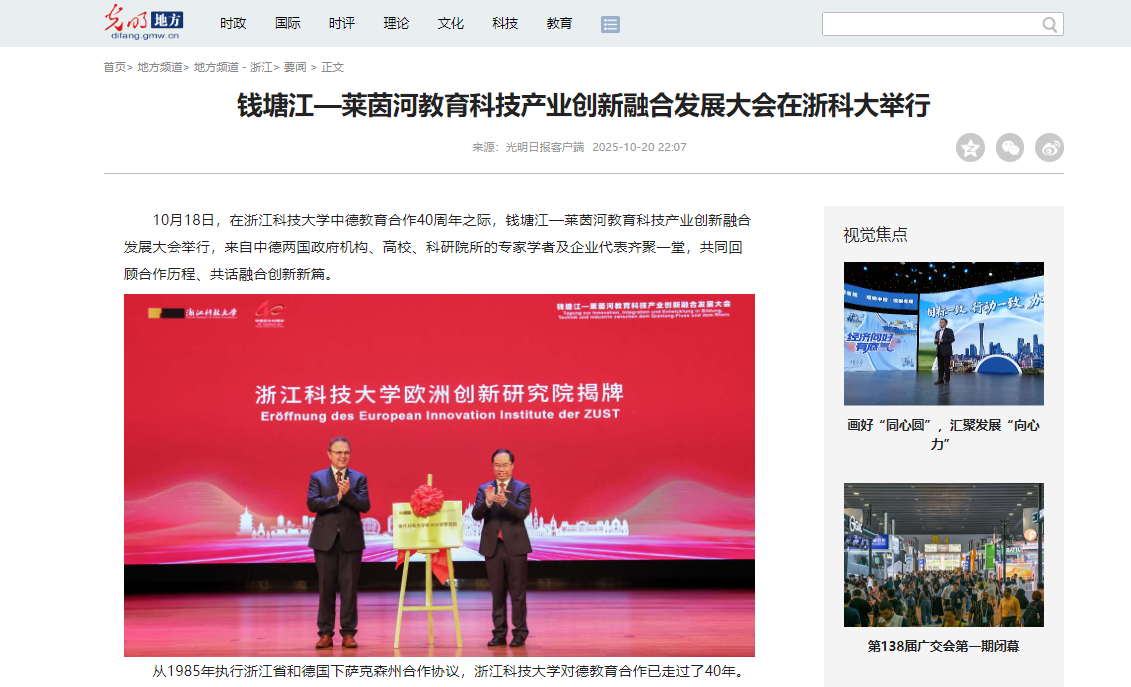 10月18日,在浙江科技大学中德教育合作40周年之际,钱塘江—莱茵河教育科技产业创新融合发展大会举行,来自中德两国政府机构、高校、科研院所及企业的嘉宾齐聚一堂,共同回顾合作历程、共话融合创新新篇。光明网...