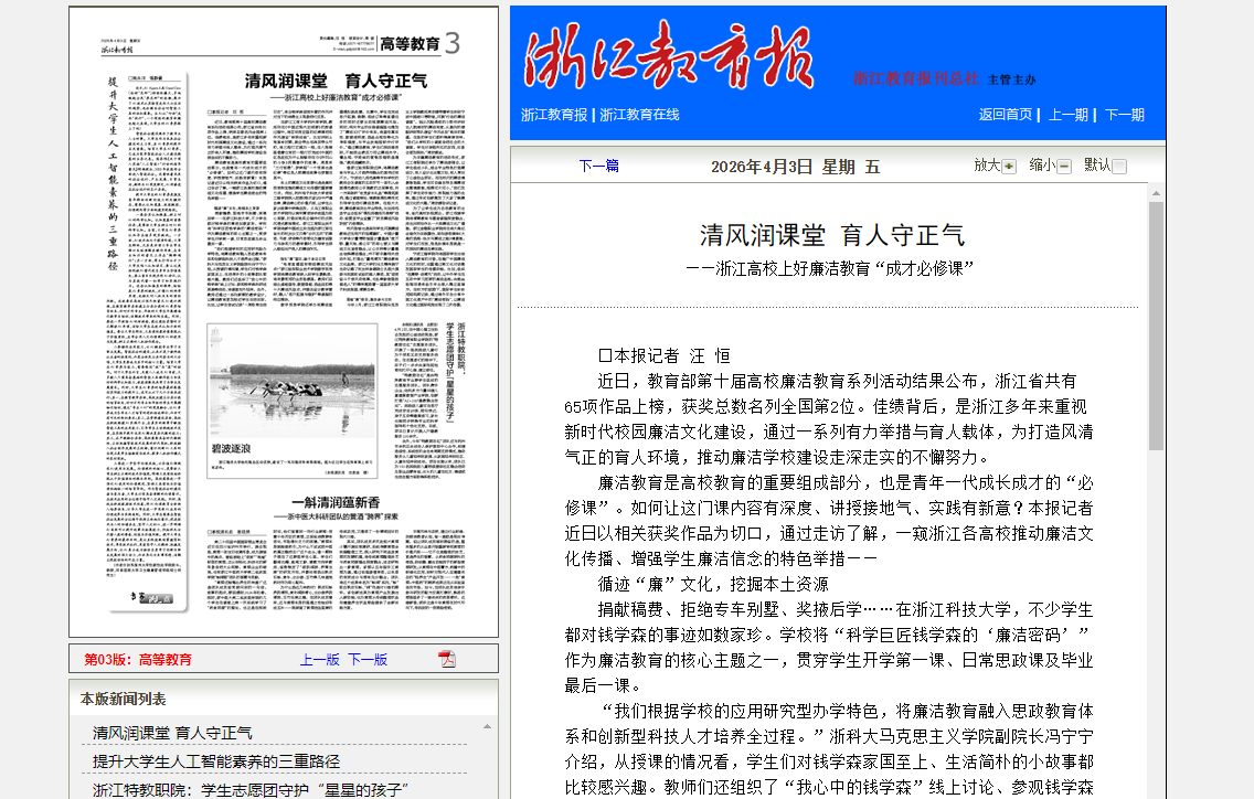 近日,教育部第十届高校廉洁教育系列活动结果公布,浙江省共有65项作品上榜,获奖总数名列全国第2位。佳绩背后,是浙江多年来重视新时代校园廉洁文化建设,通过一系列有力举措与育人载体,为打造风清气正的育人环...