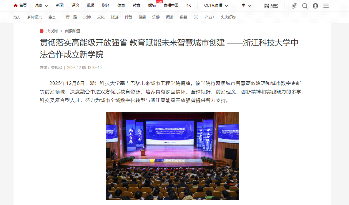 央视网:贯彻落实高能级开放强省 教育赋能未来智慧城市创建 ——浙江科技大学中法合作成立新学院