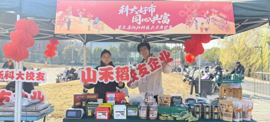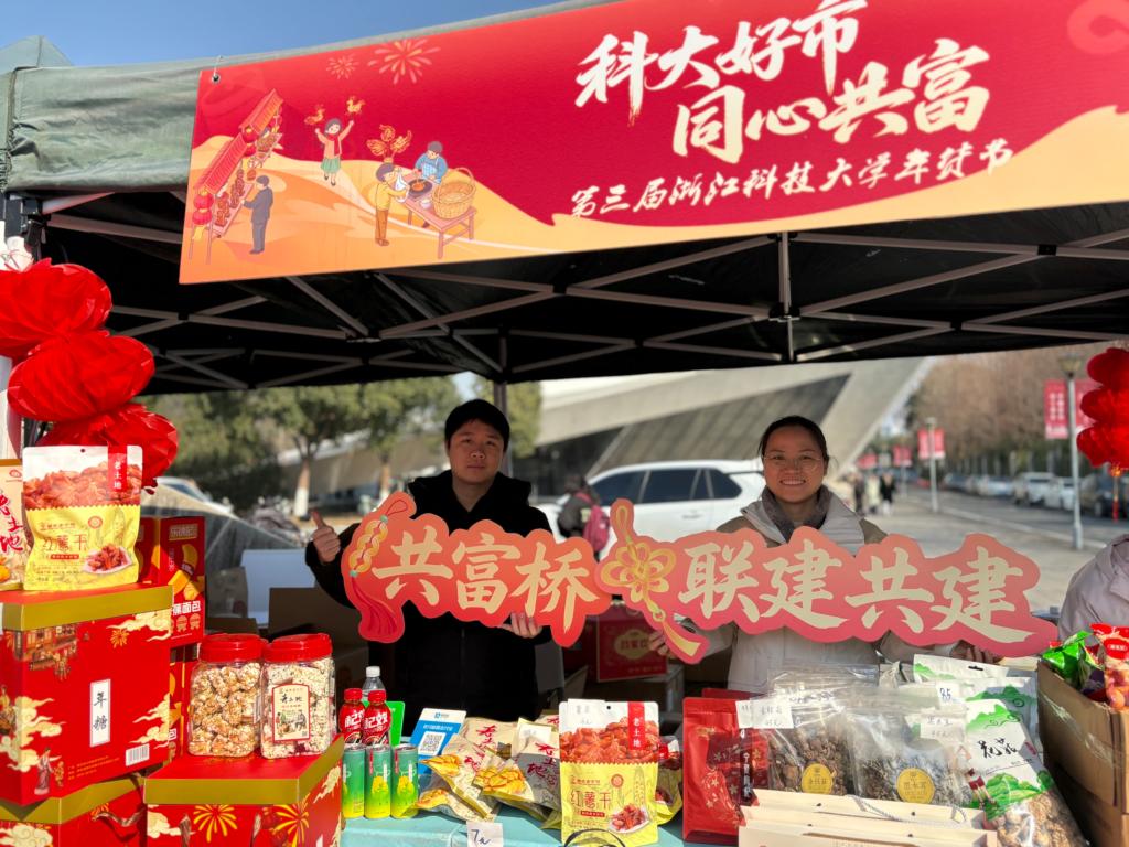 “以前觉得共同富裕离我们很远,但今天看到这么多帮扶产品,听到驻村干部的讲解,感觉参与乡村振兴就在身边。”1月8日至9日,小和山校区学生活动中心西侧广场人头攒动、热闹非凡,在年货节上采购到阿克苏苹果的学生小郭高兴地说道。在为期两天的“科大好市 同心共富”浙江科技大学年货节现场,30余个摊位整齐排列,传统腊味、现制美食、校友产品、帮扶农产等一应俱全,师生在现场不仅能一站式选购到心仪的土特产,更能感受到浓浓的年味和烟火气。