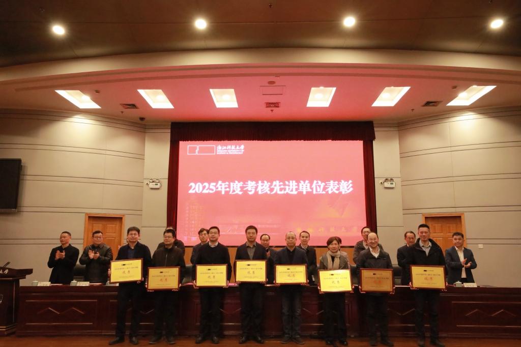 会议表彰了2025年度基层党建工作目标管理考核优秀单位和综合考核先进单位。校领导班子成员为获奖单位颁发奖牌。