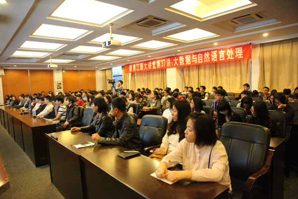 孙茂松通过《爆发:大数据时代预见未来的新思维》、《黑天鹅》两本畅销书,引出大数据能产生洞察力这一话题,他用详实的例证,为现场师生说明了语言计算的本质是结构预测。他指出汉语是世界上最难被计算机理解的语言之一,实时正确解读互联网中的海量中文信息,可实现高精准舆情分析,最大限度地弘扬正能量,同时抑制负能量的滋生和蔓延。但目前中文语义分析准确率仅有60%,机器无法及时理解并充分利用互联网中文信息,是困扰我国相关核心技术手段发展的根本原因。