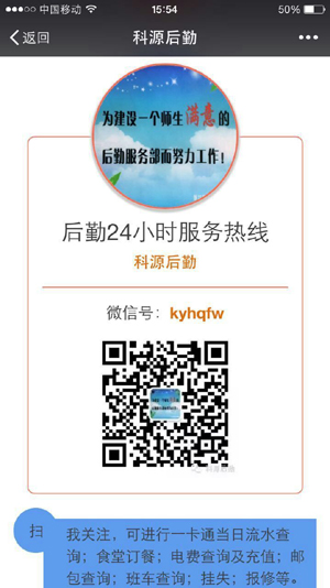 “‘科源后勤’微平台太赞了!”——这是经管学院大四孟同学在8月27日晚上为平台“微服务”点的赞。当日晚上九时许,正在寝室复习考研的他,由于忘记续存电费,寝室断电了,他通过“科源后勤”微服务自助完成电费充缴,不到5分钟,寝室恢复供电,“这在以前是想都不敢想的速度。”