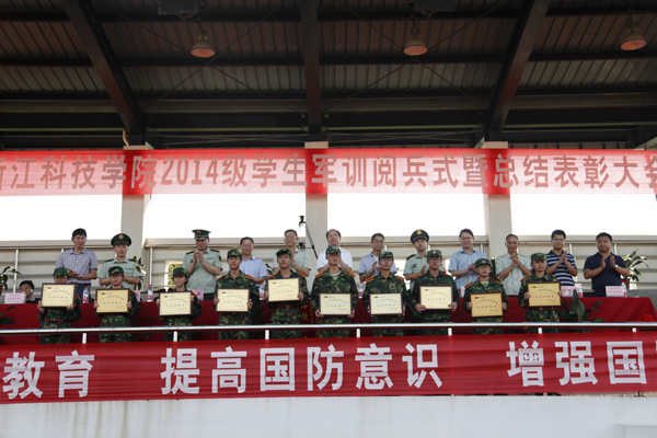 校党委书记王建华检阅参训队伍方阵并代表学校向军训承训单位赠送了锦旗。校党委副书记周加敏作军训总结。副校长、安吉校区管委会主任冯军宣读军训嘉奖名单。校长助理、安吉校区党工委书记鲁伟权,学校相关职能部门负责人、各学院学生工作负责人等参加。