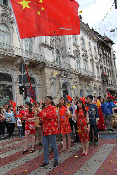 城市日期间,孔院教师、志愿者及中国留学生代表身着唐装旗袍,手举中国国旗亮相环城迅游活动,游行队伍一路上被观众夹道相迎,中国巡游队伍给市民留下了深刻印象。同时孔院还在克卢日中心公园举办了大型中国印象摄影展,中国国际广播电台罗马尼亚记者Dan Tomozei亲自拍摄的15幅长2米,宽一米的巨幅中国风景图片在公园绿草莹莹的树林里与罗马尼亚风景图片展一起让过往的公众驻足停留,欣赏中罗两国美丽的自然风光。