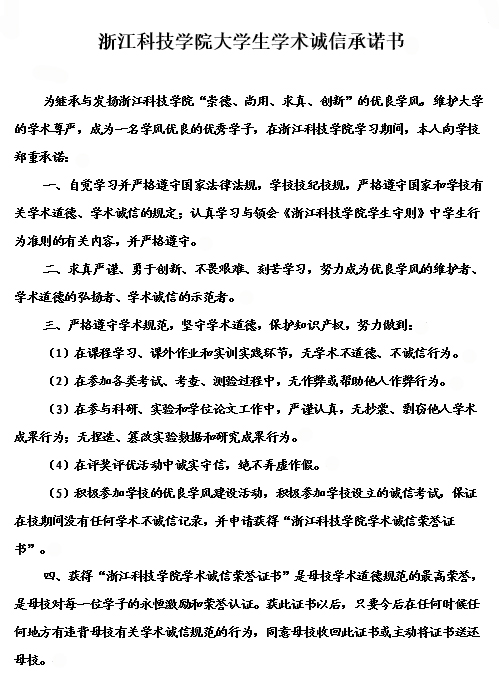 期末考试前,3700余名大一学生在《浙江科技学院学术诚信承诺书》上庄重签字,承诺:自觉遵守有关学术道德、学术诚信的规定,求真严谨、勇于创新、不畏艰难,刻苦学习,努力成为优良学风的维护者、学术道德的弘扬者、学术诚信的示范者。中德工程师学院学生同时签署德文版承诺书。