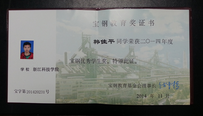 日前,2014年度宝钢奖学金评选结果揭晓。经过学院推荐、学校审核、公开竞评并由浙江大学推荐等环节,我校理学院信息与计算科学112班韩佳平同学获此殊荣。