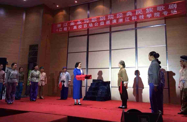开场前,著名女高音歌唱家、国家一级演员金永玲女士向现场观众介绍了歌剧的基础知识、艺术价值和文化传播的影响力。精彩演出随后登场,观众随着歌声和音乐声,来到了那个战火纷飞、硝烟滚滚的年代。江姐坚贞不屈、视死如归,为革命事业壮烈牺牲的英雄事迹给现场师生深深的震撼,广大师生在欣赏高雅艺术的同时也接受了一次爱国主义教育和革命传统主义教育。全体演出人员高度的敬业精神和精湛的演艺技巧也深深折服了现场观众。《红梅赞》、《绣红旗》、《我为共产主义把青春贡献》、《五洲人民齐欢笑》……剧中一曲曲熟悉的经典唱段引起了观众的强烈共鸣,现场响起了十余次热情的掌声。演出结束后,周加敏对浙江金永玲歌剧院来我校无偿演出表示敬意和感谢,并发出邀请期待下次再来我校演出。