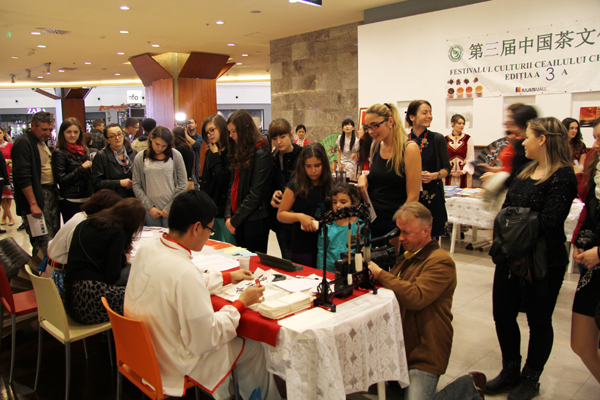 活动现场还为观众提供了许多互动节目:中国茶文化纪录片播放、中国文化书籍展示、抽取印有中国古代哲学家语录的罗语精致书签、中国剪纸体验、生肖文化讲解和中国传统益智游戏体验等。孔子学院学员Bogdan Misaila表演了中国的传统武术五行拳,腾挪跳跃中尽显武术神韵。孔子学院朱晓宾老师表演了梅花拳和四十二式太极拳,气韵生动,动作流畅。在中罗教师现场为观众用毛笔书写汉语名字的展台前,始终有热情的观众排队等候,成为本次茶文化节中最受欢迎的活动。