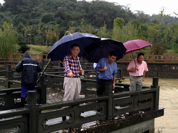 暴雨,暴雨,大暴雨……10月6日深夜开始,受超强台风“菲特”影响,杭城暴雨不歇,留和路积水严重,小和山校区与外界正常交通受到严重影响,校内部分低洼处严重积水,校领导统一部署,全校上下众志成城,抗台排涝抢险,确保学校和师生人身财产安全。8日一早,校党委书记王建华、副校长冯军在相关职能部门负责人陪同下,仔细查看了校园,校园安全无恙。