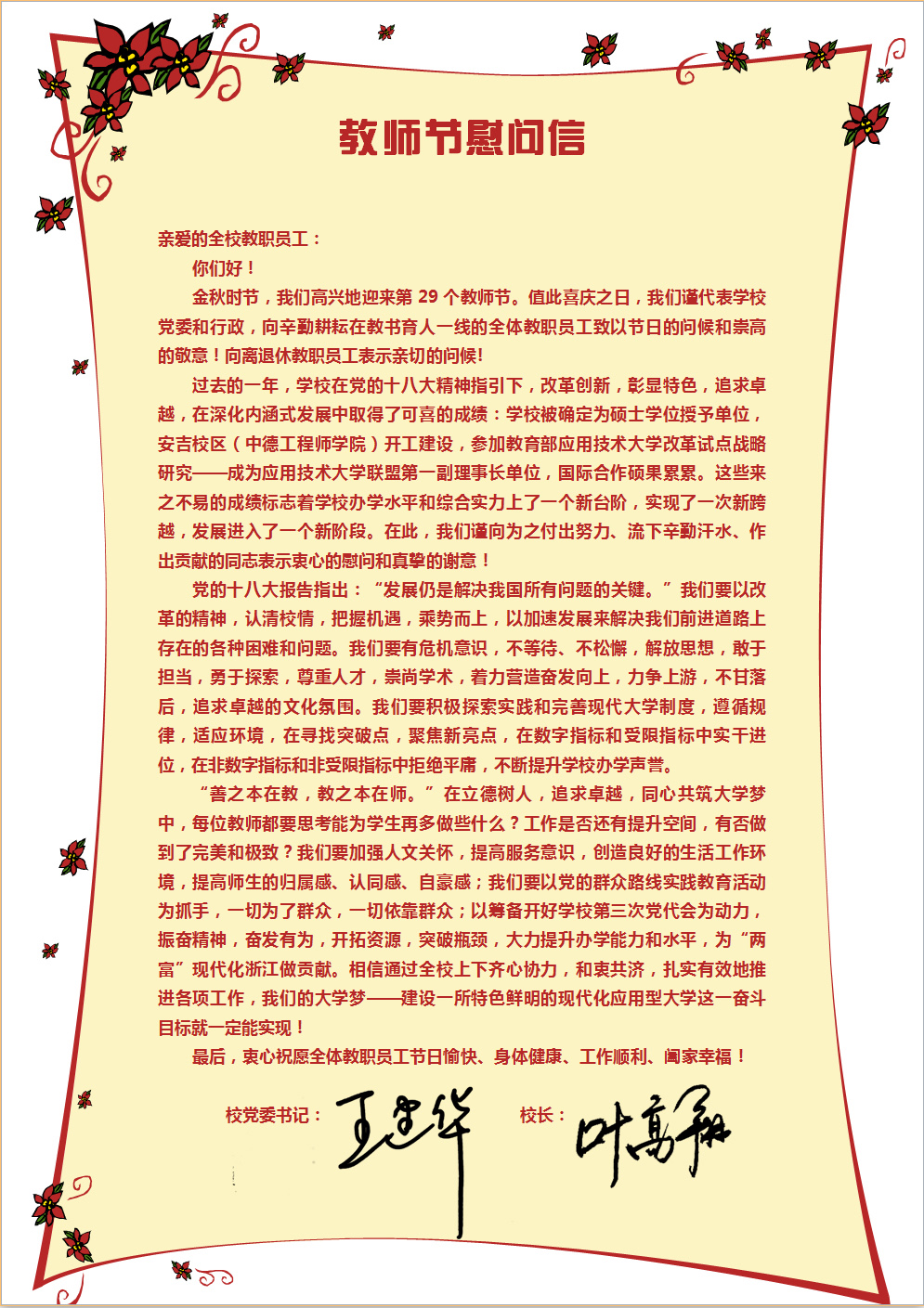第29个教师节致全校教职工的慰问信